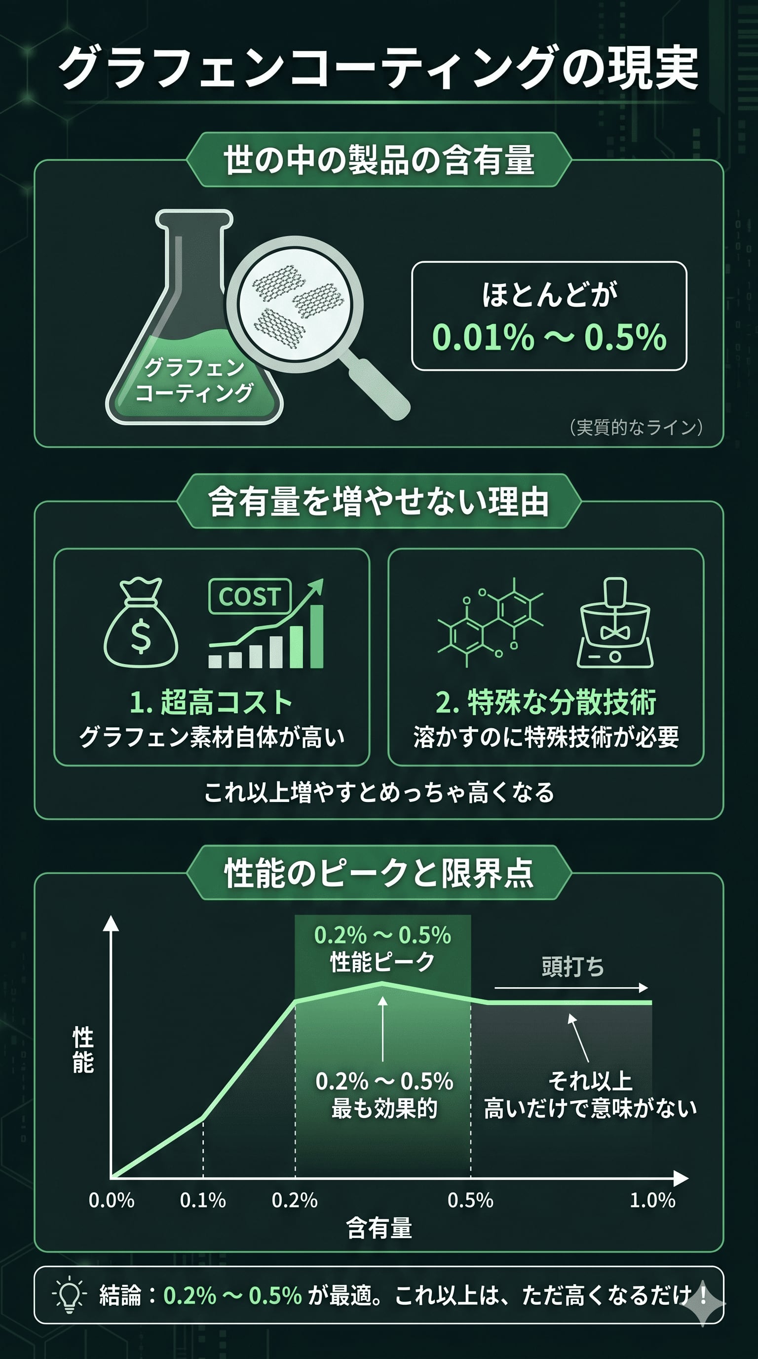 世に出回っているグラフェンコーティングのほとんどは、含有量が0.01% 〜 0.5%程度。
