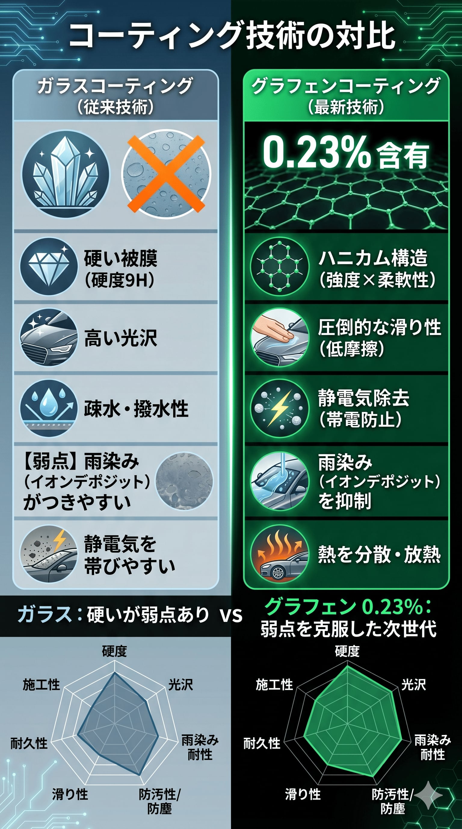ガラスコーティングの「硬さ」や「無機質」ゆえの弱点を、グラフェンが完全にカバーします。
