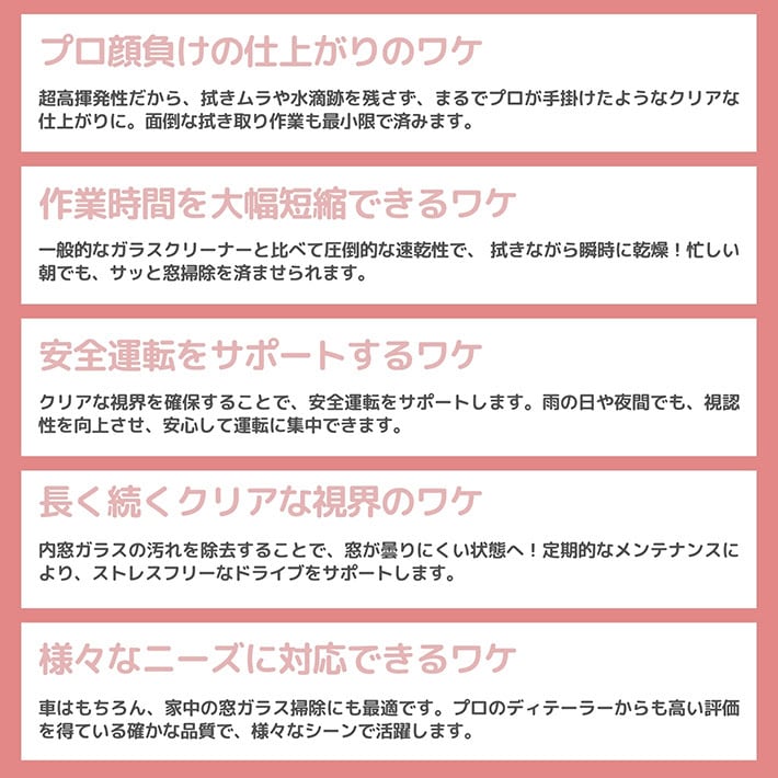この高い揮発性が、拭きムラや水滴の跡を防ぎ、ピカピカの仕上がりを実現します。