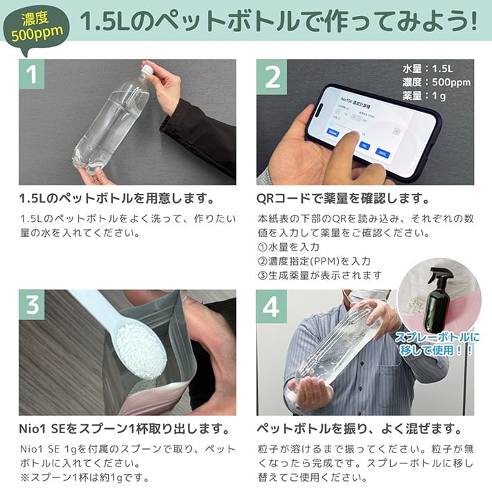 薬液を生成後スプレーボトルに入れてご使用してください。